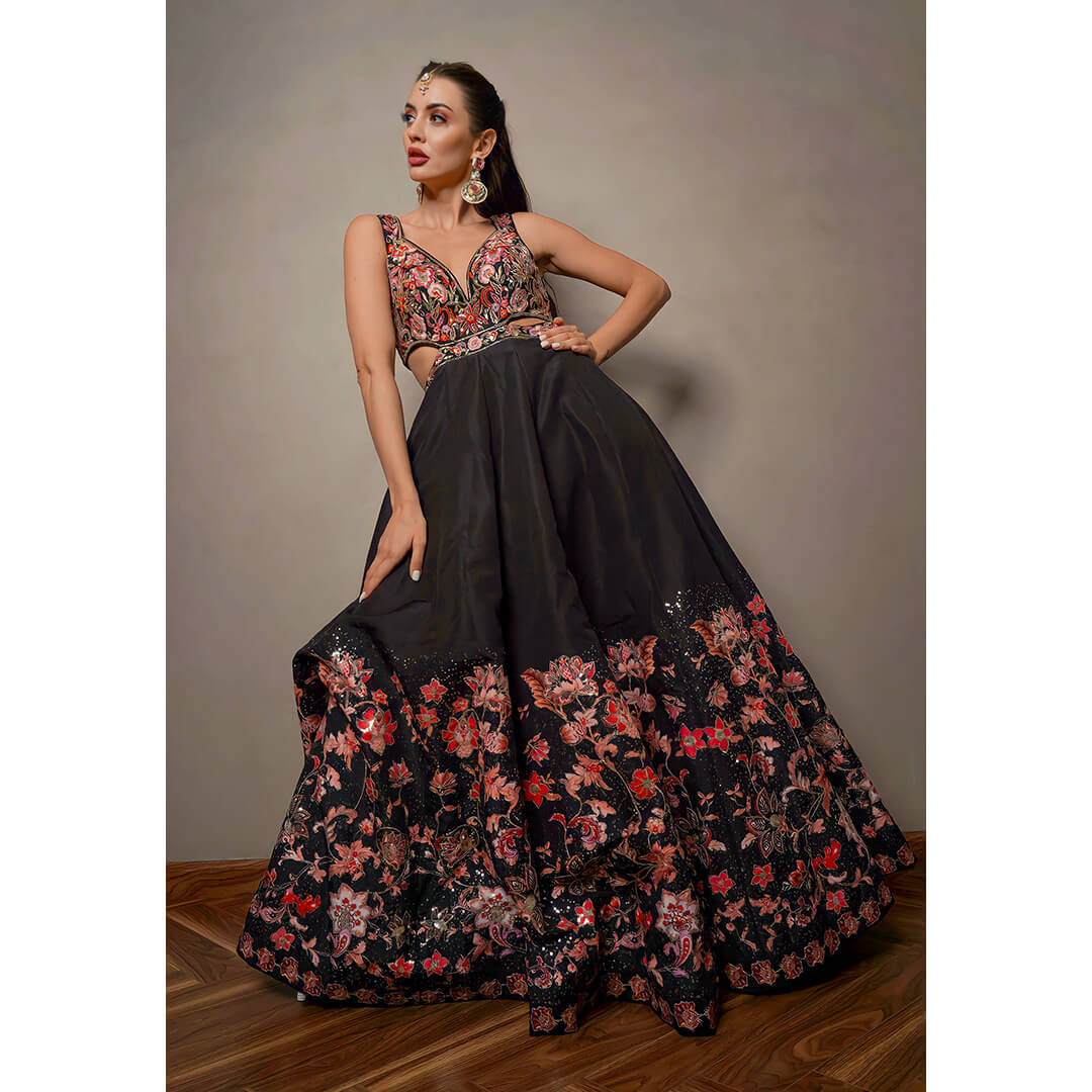 Black floral Anarkali dress with thread and sequins work. Comes with a net dupatta.