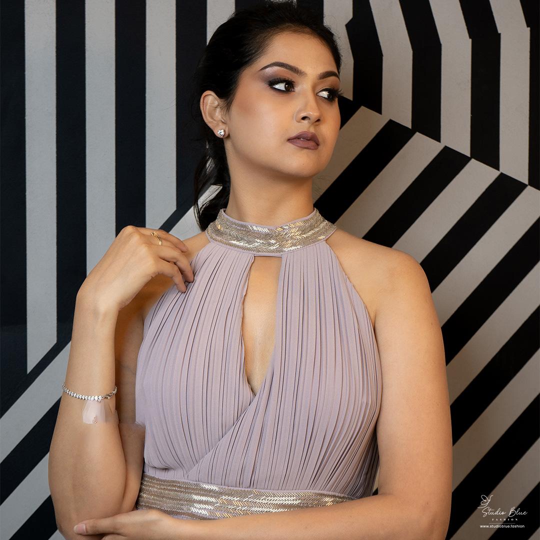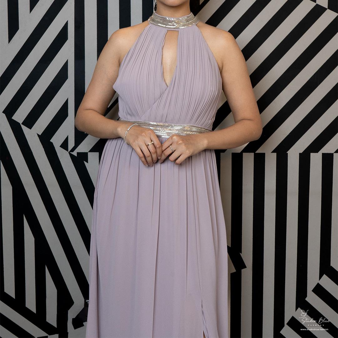 Silver Beaded Halter Long Chiffon Dress Gown for Elegant Women