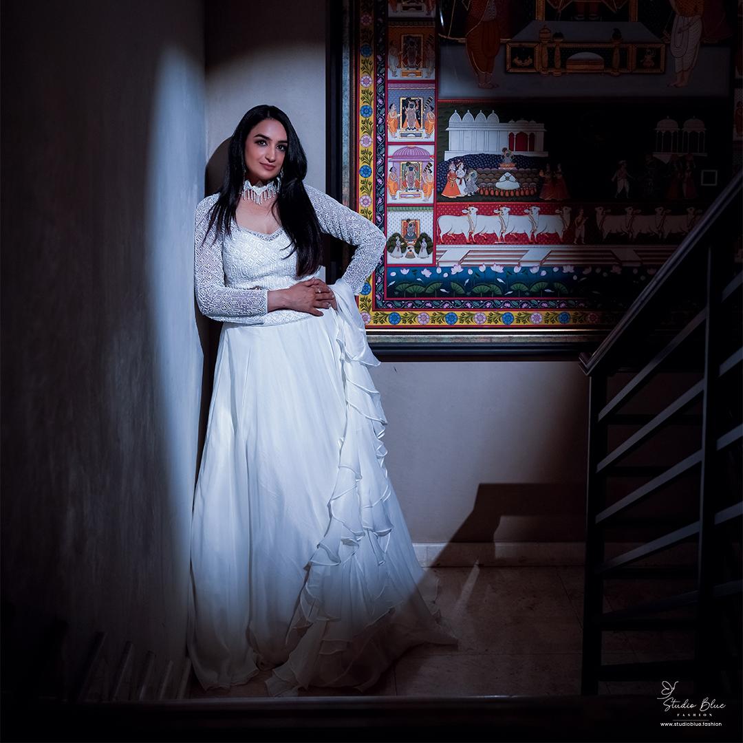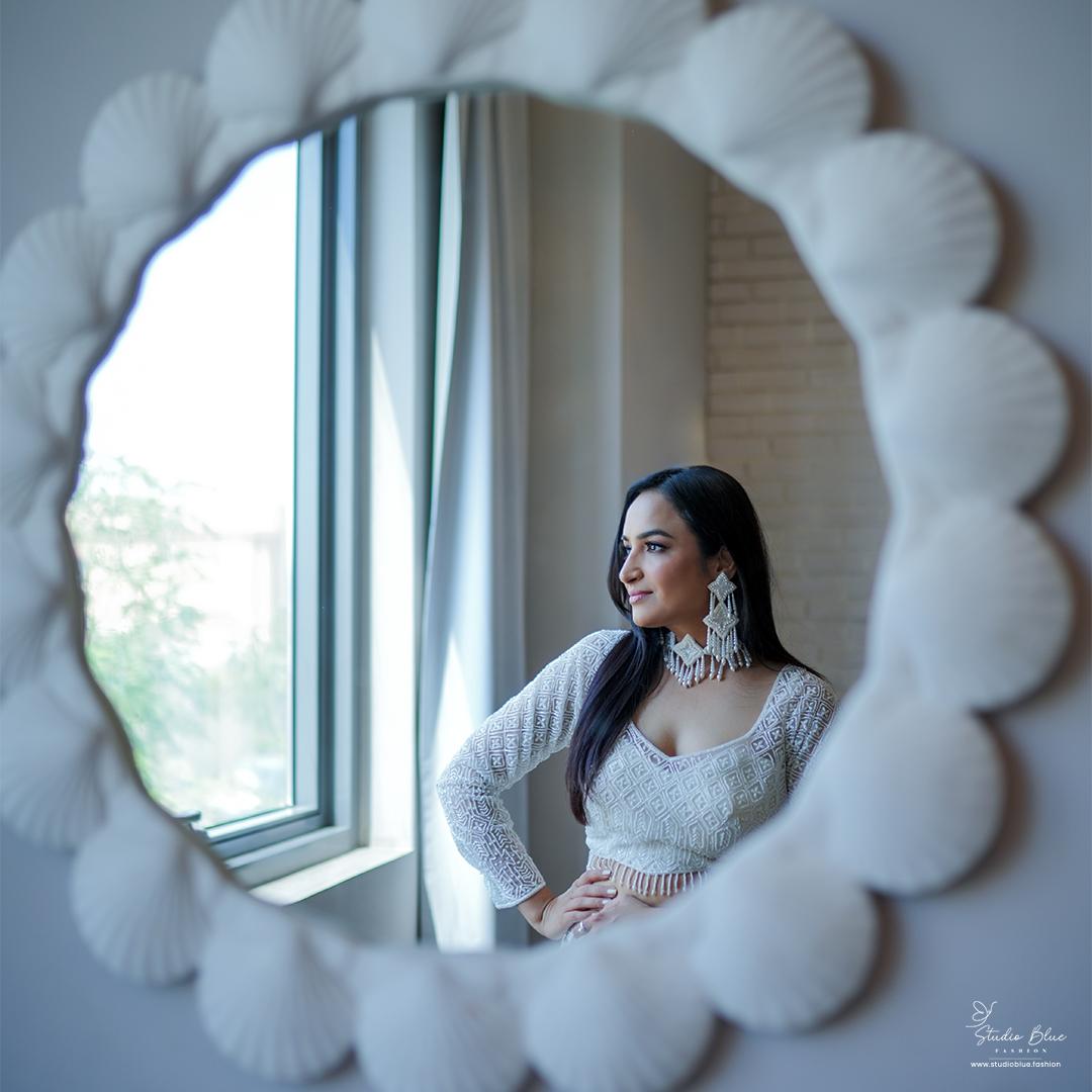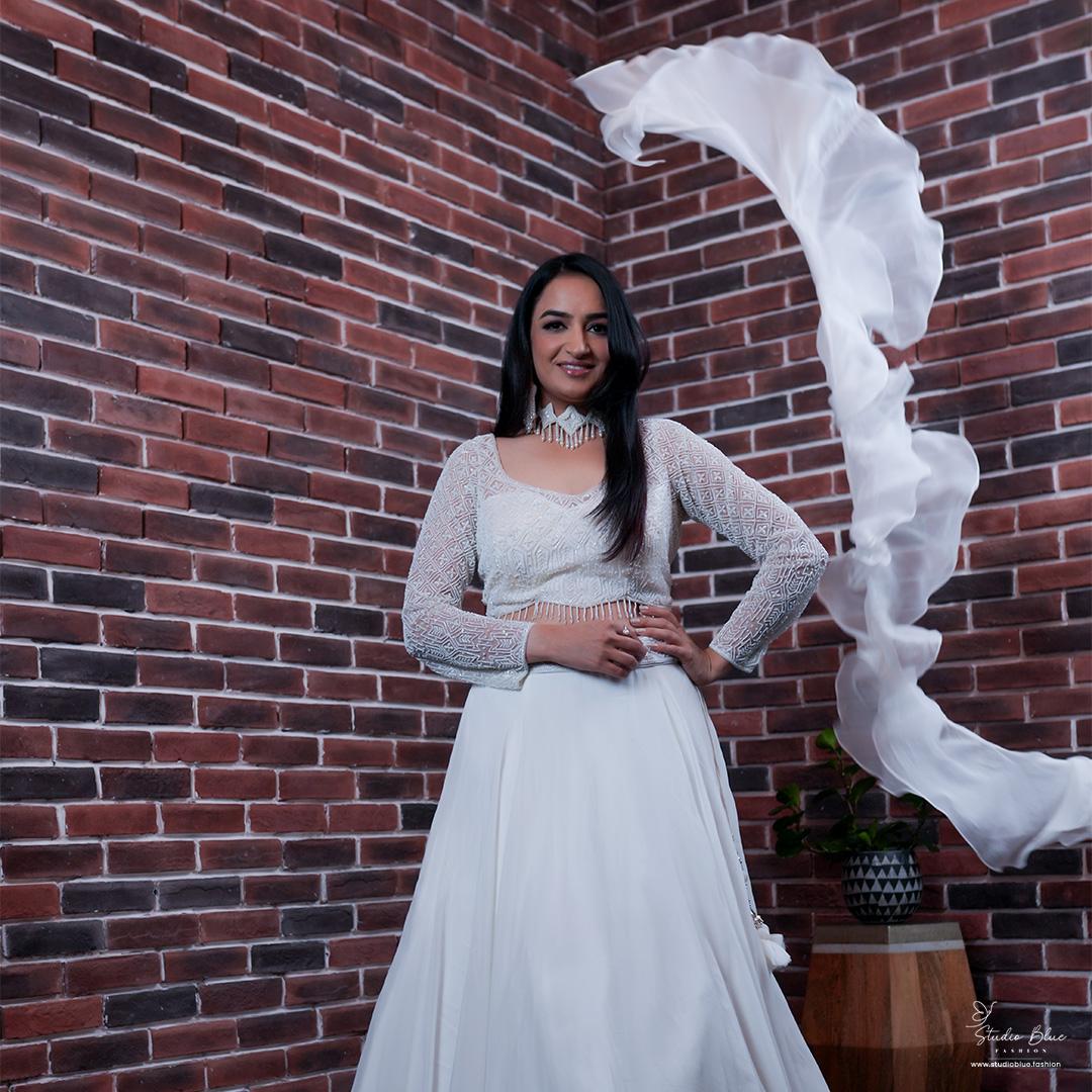 Long sleeved net top with cutdana, sequins and beads works. Lehenga fabric-organza with sequins and beads works on the waist. Dupatta – plain organza.